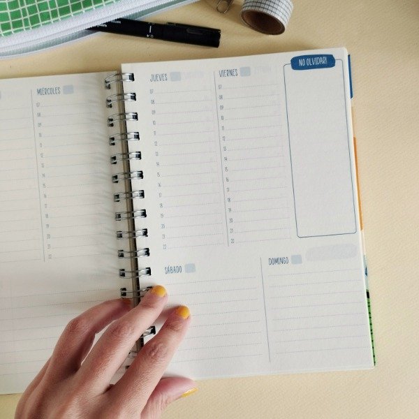 👉Viene con la semana a la vista, de lunes a domingo (como siempre), pero sin los números de las fechas. Entonces es más libre, abierta y versátil.